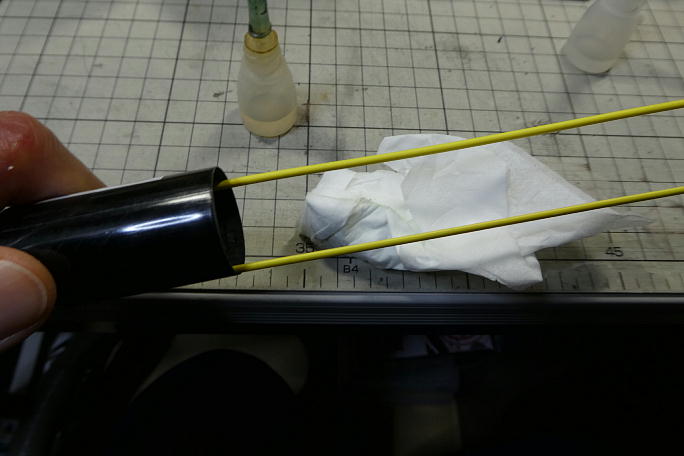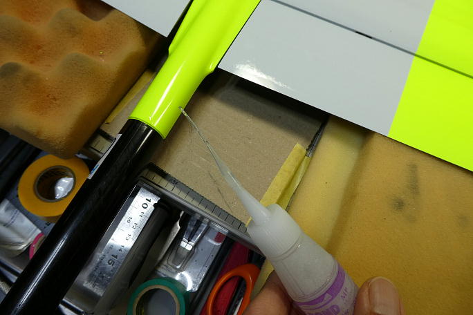 ポッドとブームのはめ合いはキツキツです。 均等に接着剤が回る様に、デコボコを修正しておきます。 差し込んだブームを何回かネジって、ポッドのキズ具合を確認します。 カーボンブームの黒い跡が付いたところは盛り 上がっている部分なので、削って調整します。 ![]() 削り調整が終わった接合部です。 ![]() 接着部を硬化促進剤で拭いておきます。 硬化促進剤には持続時間の長いロックタイトの712を使用します。 ![]() ブームの接着部の内壁も硬化促進剤で拭いておきます。 こちらもロックタイトの712を使用します。 ![]() ![]() 水平尾翼をブームに取り付け、主翼に水糸を張った線と水平尾翼とのアライメントを確認し、合っていればポッドとブームの 接合部分に低粘度瞬間接着剤を染みこませて接着します。 ![]() ![]() ![]() 抜け止めに1.5ミリカーボンロッドを短く切った物を差し込みます ツライチになるまで押し込んだ後、カーボンロッドの頭に 低粘度瞬間接着剤を流します。 |