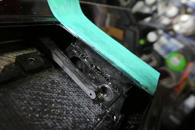 ![]() サーボベースと下面スキンを接着接続します。 負荷を上面スキンだけで無く、下面スキンに分散させるためです。 3ミリのスクラップバルサを整形してサーボベースと下面スキンの隙間に押し込み、中粘度瞬間接着剤で接着します。 ![]() マスキングをして、カーボンパウダー入り5分エポキシを充填して補強とします。 |