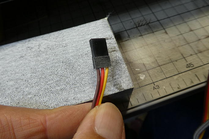 ![]() 胴体と連結するコネクタはフラップサーボの延長オスコネクタとエルロンサーボの延長オスコネクタを束ねますが、 この部分の段が不要な厚みを生んでしまうので、削り落としておきます。 ![]() コネクタとピンヘッダを束ねて、付属のシュリンクチューブでまとめます。 |