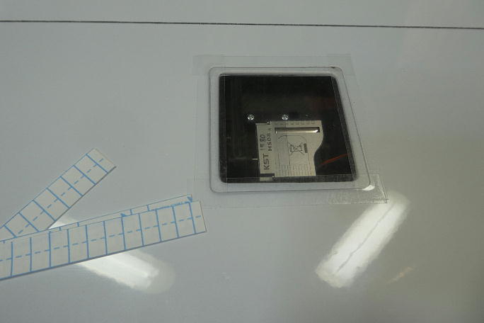 カバーフイルムを10ミリ幅に切って作ったテープで、メーカー付属のサーボカバーを取り付けます。 |