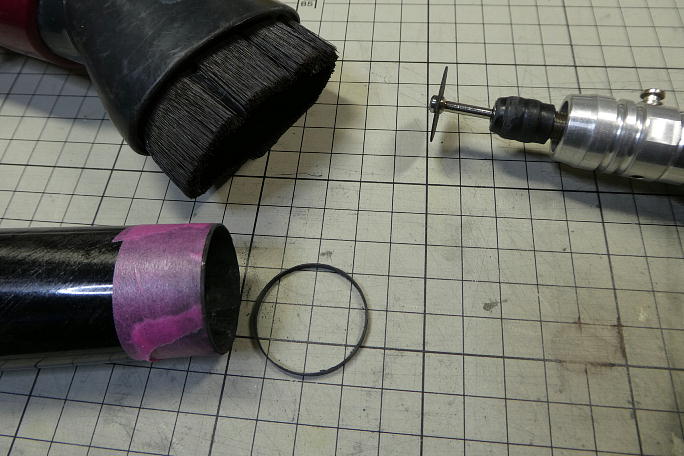 ![]() ノーズの開口部径が28ミリ程度なので、スピンナーに合わせて30ミリの位置まで、約3ミリ切り取ります。 マスキングテープでカットラインをマスキングしておきます。 ![]() リューターの切削砥石で切り取ります。 胴体が3分割で工作する部分が短くて助かります。 ![]() 開口部内部をサンディングしておきます。 合わせ目の盛り上がり等があるので、平らに削り落としておきます。 |
