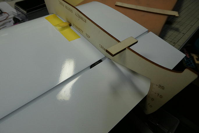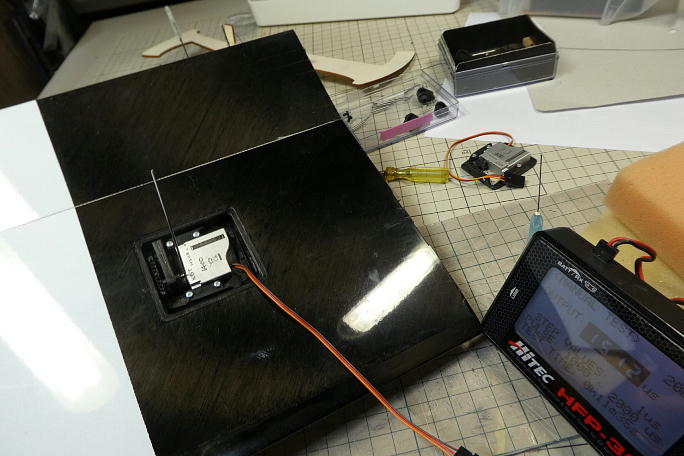 ![]() 付属のテンプレートでエルロンのニュートラルを確認します。 ![]() サーボホールの接着面とサーボベッドの接着部を硬化促進剤で拭いておきます。 硬化促進剤にはロックタイトの712 を使用します。 ![]() サーボのニュートラルを合わせて四隅のみ中粘度瞬間接着剤で点付けの仮接着をします。 軽く動作チェックをして 問題が無ければ、サーボベッドの全周に中粘度瞬間接着剤を流してサーボベッドを本接着します。 こちらはサーボホーンのニュートラルを100μs分オフセットした方の翼で、反対翼のニュートラルは1500μsが ニュートラルです。 ![]() 動作チェックをしておきます。 |