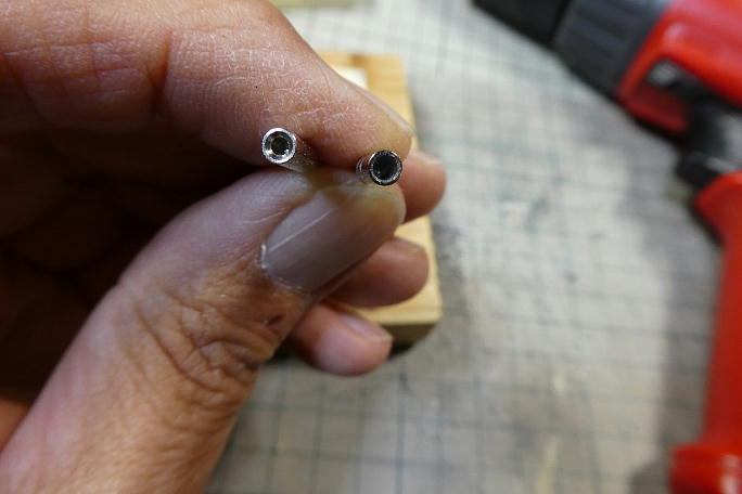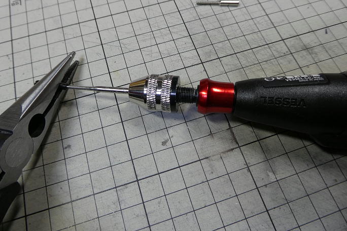 ![]() ロッドエンドを使用するため、クレビスにはM2のタップで予めネジを切っておきます。 ![]() ロッドエンドはテトラのSサイズ1.2〜1.4ミリ用の物ですが、2ミリのドリルで穴を広げます。 ![]() 右が加工済みのロッドエンドです。 2ミリ用Mサイズはとても外径が太くなってしまうため、このサイズを使用しています。 ![]() 組み合わせておきます。 |