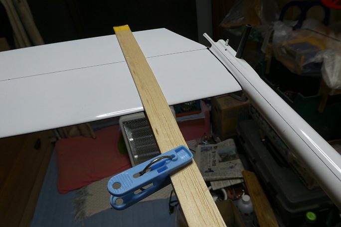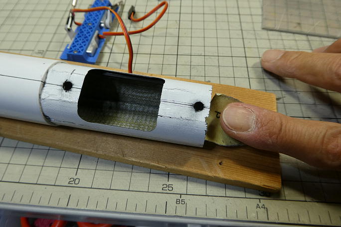 ![]() サーボを取り外すためにドライバーを刺す穴を開けます。 サーボベッドの蓋部分のネジの間隔で穴を加工します。 ![]() ドライバーを刺してみました。 ![]() サーボベッドを接着する部分をサンディングしておきます。 ![]() サーボベッドの接着面もサンディングしておきます。 サーボベッドと胴体の接着部分は硬化促進剤で拭いておき、サーボベッドのネジ位置ととドライバーのサービスホール の位置を合わせて、低粘度瞬間接着剤で接着します。 |
