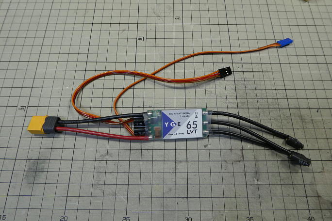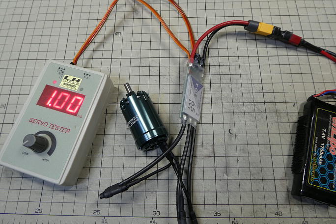 モーターコネクターはリバースタイプで取り付けます。 0.26ミリの銅線で縛って仮固定します。 ![]() ハンダ付けが完了しました。 ![]() ![]() サーボテスターを使ってモーターの回転方向を確認します。 ![]() 回転方向を確認できたら、コネクターにアイマークを入れます。 外したときに再接続が楽にするためです。 |
