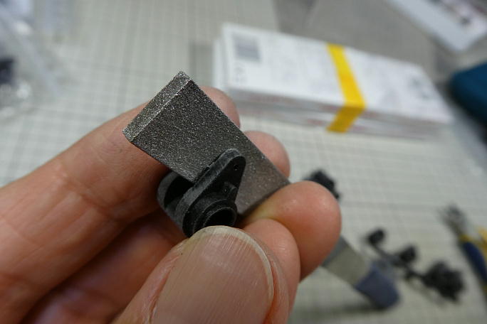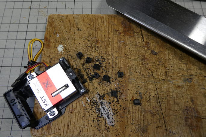 ![]() サーボホーンはフラップ用には大きい方から三番目、エルロン用には小さい方から二番目の物を使用します。 一つのセットからエルロン、フラップ両方のホーンを供出しました。 ![]() ![]() サーボラーメンのこの手のパーツ類はバリやヒケが沢山あるので、組み付ける前に綺麗に整えてあげます。 ![]() ベアリングを入れる軸部分が若干太く、ベアリングを入れるのがとてもキツいです。 本来、ベアリングはサーボベッド にセットされる物ですが、軸にベアリングを押し込んでしまうと、サーボを取り外した時には、ベアリングごと抜けて くるありさまです。 ベアリング軸を削って調整する必要がありますが、今回は圧入用に買ってあるX10用の軸にホーンを取り付けて、 ドリルにセットして回しながら削りました。 ![]() 事前にサーボベッドにサーボ取り付けねじを出し入れして、ネジを切っておきます。 サーボベッドを接着する際に、 一度サーボを付け外ししますが、無用な力を掛けずに済みます。 電ドラボールを使うと、楽に出来ます。 ![]() KST用のサーボホーンはとてもキツく出来ているので、取り付ける前にバーナーで表面が僅かにヌラッとする程度 まで温めると入れやすくなります。 ![]() サーボホーンは1520μsのニュートラルでサーボと直角になる位置に取り付けます。 今回はフラップサーボも スプラインをずらすオフセットは行いません。 ![]() サーボをサーボベッドに取り付けます。 取り付けにはポジドライブドライバーを使用します。 ![]() KST用のサーボベッドはX10とX10ミニが共通なので、X10ミニの場合足が残ります。 残ってはみ出た部分は 切断しておきます。 ![]() ヒケでデコボコしている底面は接着不良を招くので、サンディングボードで平らになるように削ります。 |