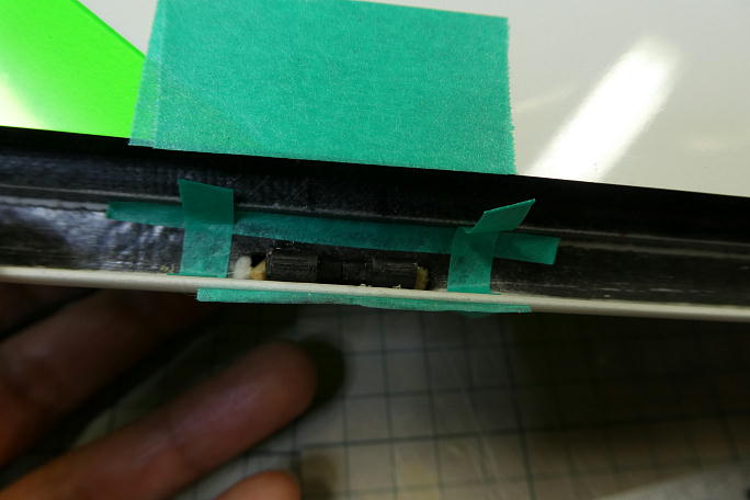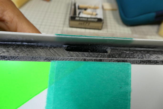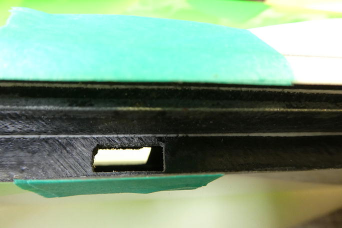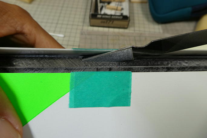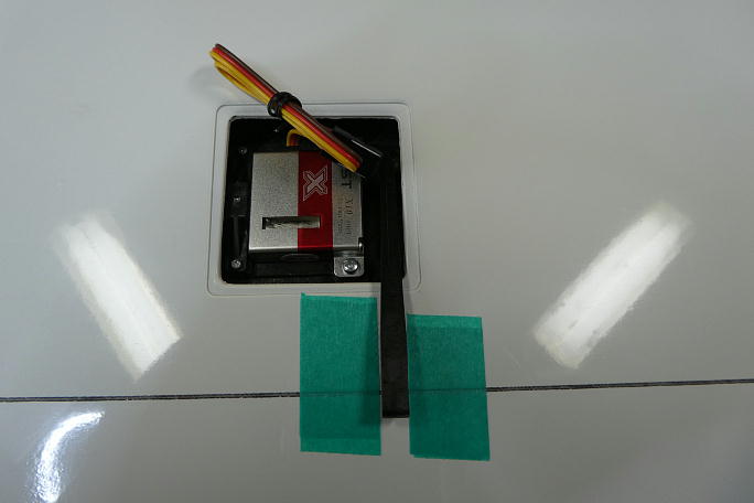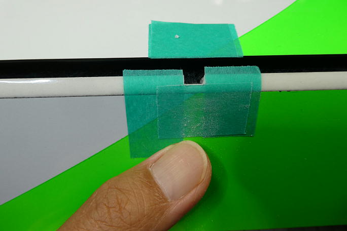 ![]() エルロンサーボもサーボベッドにサーボを4点止めにするため、サーボをサーボホーン側いっぱいにずらして設置 します。 ロッド位置をマスキングテープでマーキングします。 ![]() ロッド位置をヒンジ上部に転写マーキングします。 ![]() ![]() マーキングに沿って、ロッド穴を拡大します。 ![]() フラップホーンのスロットは上下方向は無加工で取り付けられましたが、エルロンの方は少しザックリが過ぎて、成型が 必要でした。 ![]() 横方向にも広げて成形完了です。 |