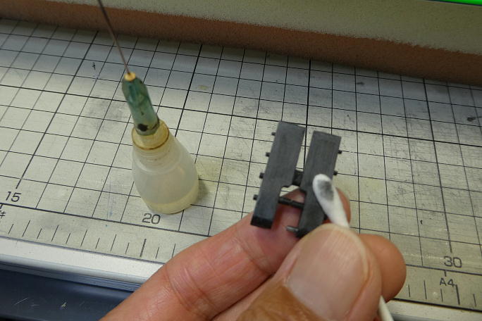 ![]() エルロンホーンの表面はロックタイトの712で拭いておきます。 ![]() 位置決めをして、5ミリのバルサ角材をゲージにします。 エルロンのスパー部分より5ミリ離れた所にピンが来る感じ になります。 隙間から中粘度瞬間接着剤を流し込み、硬化促進剤で硬化させます。 硬化促進剤にはボブスミスの物を使用します。 ![]() ![]() 隙間には潰したスクラップバルサをねじ込み、カーボンパウダー入り5分エポキシを周囲に盛っておきます。 |