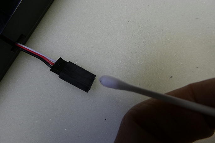![]() エルロン連結コネクタを糸ハンダを使って引き出します。 自重があり、腰がある糸ハンダがコード引き出しに重宝 します。 ![]() オスコネクタハウジングは接着するため、サンディングして足付けをしておきます。 ![]() コネクタハウジング表面を硬化促進剤、ロックタイトの712で拭いておきます。 ![]() カンザシの角度に合わせて固定し、中粘度瞬間接着剤で接着します。 ![]() 突き出しは1.5ミリ程です。 |