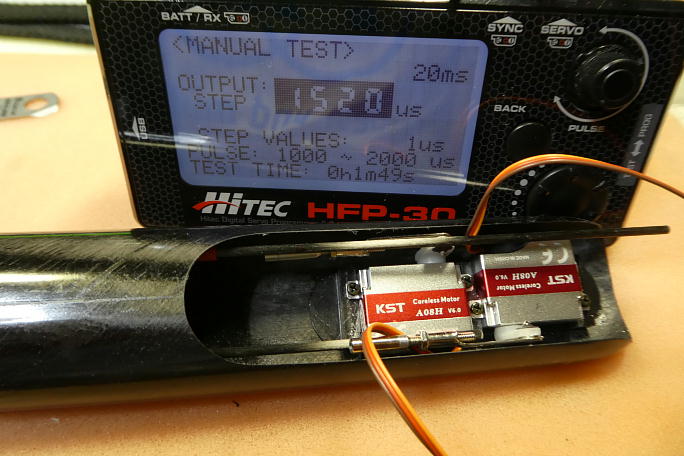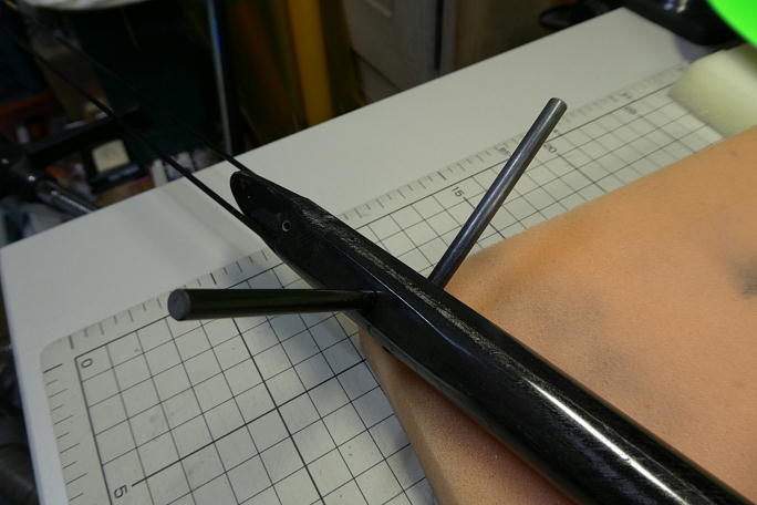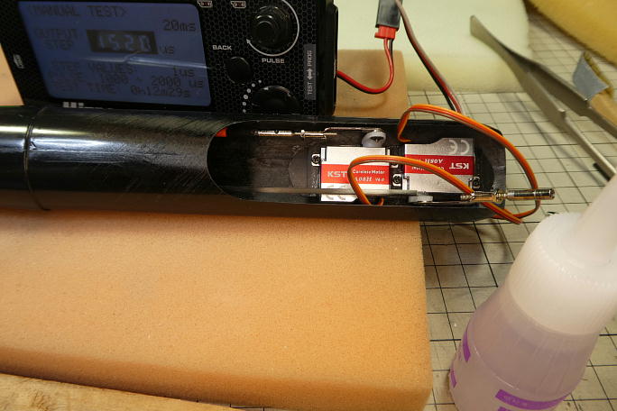 ![]() Vテールに簡易ニュートラル出しツールを取り付けてニュートラルを出し、サーボは1520μsのニュートラルのニュートラル に合わせてリンケージロッドをカットします。 ![]() カーボンパイプの接着部をサンディングします。 ![]() 用意して置いた樹脂パイプを通して、ロッドエンドとカーボパイプを低粘度瞬間接着剤で接着します。 空気抜き穴からも 瞬間接着剤を流します。 |