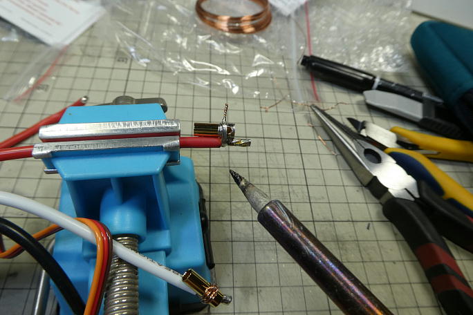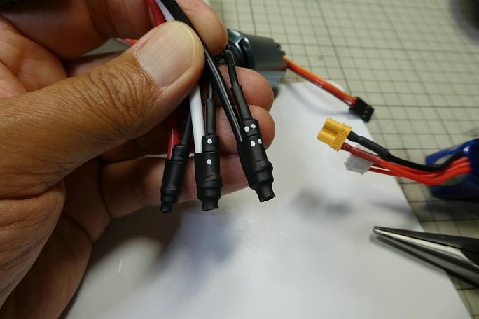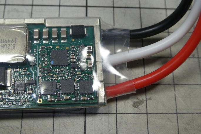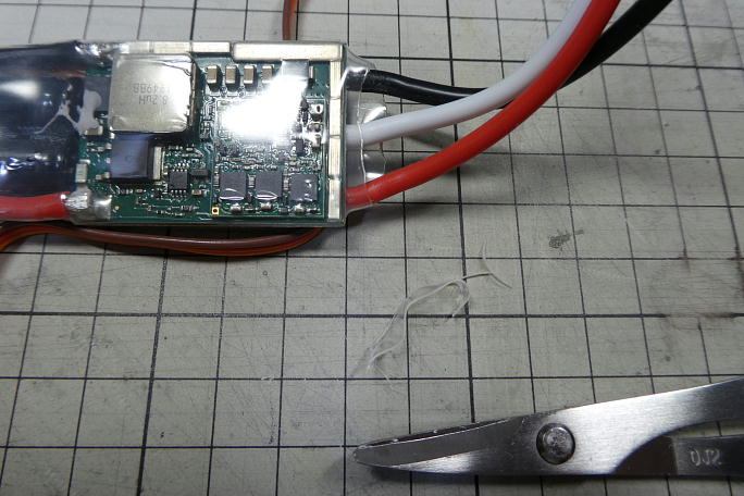 ![]() 使用するESCはINFINITYとExplorerQでも使用したCastle TARON60です。 最初は国内ディーラーから購入しましたが、 国内のディーラーが廃業してしまった為に、2回目はメーカーのオンラインショップから購入しました。 その時は送料が 1600円程度だったので良かったのですが、今回は送料が6500円も掛かってしまいました。 ![]() スペースを確保するために、ESCのコードを折り返すように取り回します。 その為に、モーターコードを被覆している シュリンクチューブを基板ギリギリまで切り取ります。 ![]() ゴールドコネクターを取り付けるために被覆を少し長めに剥ぎます。 ![]() ハンダ付け作業がしやすいように、0.26ミリの銅線で縛って、仮止めをしておきます。 ![]() ハンダゴテの温度を上げて、全体にしっかりハンダが回る様にハンダをあげます。 職場ではハンダは「あげる」物 だったのですが、これは業界用語でしょうか? ![]() 銅線を撚った部分や、尖った部分を処理してシュリンクチューブで保護します。 ![]() バッテリー側はXT30コネクタを取り付けます。 一般的には消費電流からXT60コネクタを使用しますが、きむらクラフト 機では全てXT30コネクタに統一しています。 モーターを回す時間が最大で30秒と少なく、フルパワーも出す事が無い ので、省スペースなXT30コネクタを使用しています。 ![]() コード部分とコネクタの一体感を出すため、全体にシュリンクチューブを掛けています。 ![]() PCに接続して、専用ソフトでブレーキ設定を行います。 BEC電圧は8Vも選べますが、6Vのままです。 ![]() サーボテスターを使用して、低速でモーターを回し、シャフトに軽く触れて回転方向を確認しておきます。 ![]() モーターコードをESCのコネクタから抜いた時に、元に戻せるようにアイマークを入れておきます。 |