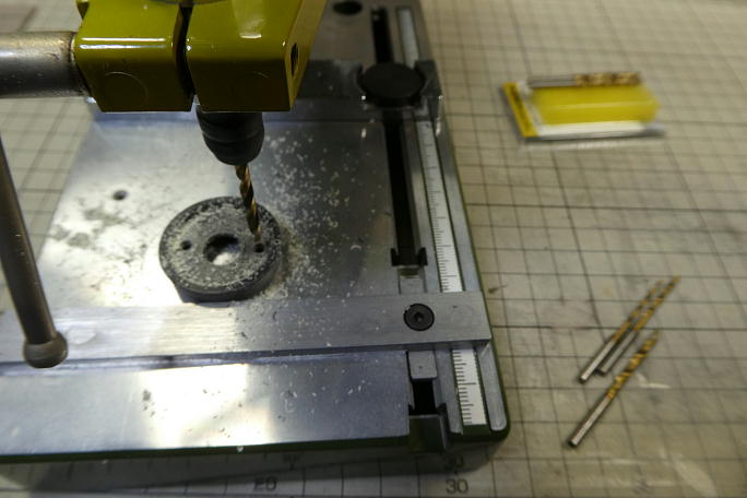 ![]() 毎回ではありませんが、Xpower、タマゾーのダイレクトモーターがマウントに入らない時があります。 今回は入らない パターンで、モーターマウントの内側の角を少し削る事で入る様になります。 ![]() PCで製作した型紙をスプレー糊でモーターマウントに貼り付けます。 モーターは16ミリ間隔と19ミリ間隔の取り付け 穴がありますが、今回は19ミリの穴のみの2点止めにします。 ![]() ポンチを打ってマーキングをします。 ![]() リュータースタンドで穴開けをします。 1.5ミリドリルから少しずつ拡大して、3ミリドリルで仕上げます。 ![]() フリードリルで皿穴加工をします。 電ドラボールを使用しています。 ![]() 仮組みをしてフィッティングを確認しておきます。 |