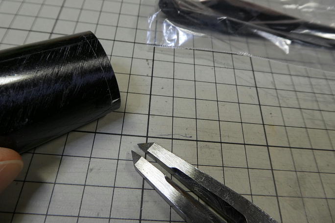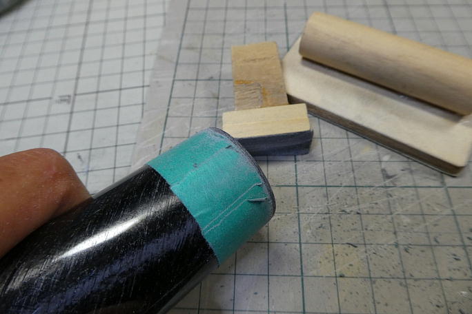 お約束で、モーターマウントのフランジ部分が胴体より出っ張ります。 ![]() マスキングテープで養生をして、はみ出た部分を削り落とします。 ![]() 整形の終了したノーズです。 |