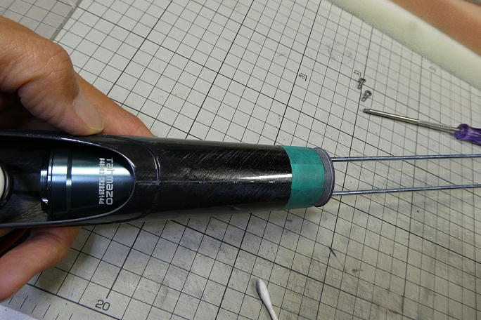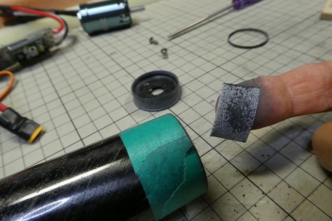 ![]() スピンナーからノーズに綺麗に繋げる為に、ノーズの開口部のサイズを合わせます。 そのままですと開口部の外径 は28ミリ程度しか有りませんので、30ミリに合わせます。 ノギスで30ミリの位置を探し、3ミリカットする事にしました。 ![]() リューターの切削砥石でカットします。 ![]() 胴体内部のパーテーション部分の盛り上がりを削って平らにしておきます。 ![]() モーターマウントと胴体内部の接着部を硬化促進剤で拭いておきます。 硬化促進剤はロックタイトの712を使用します。 ![]() モーターのコードが下に来る位置にモーターマウントの角度を合わせます。 M3の長ボルトを使用して、モーターを マウントまで引き出し、位置を合わせます。 ![]() モーターを外して、外周のマウントと胴体の隙間に低粘度瞬間接着剤を流しモーターマウントと胴体を接着します。 シャフト穴から胴体の内側にも低粘度瞬間接着剤を流します。 |