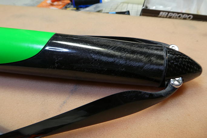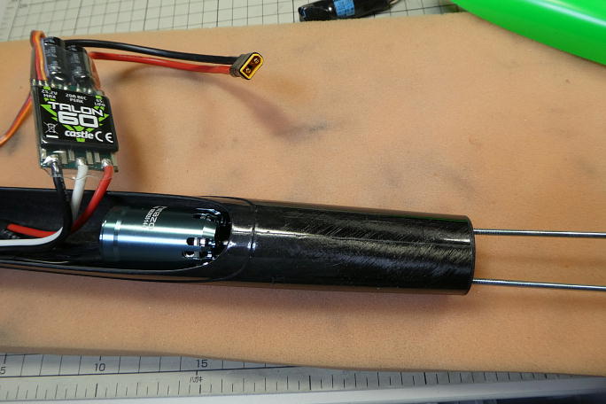 ![]() ESCをセットしたモーターをM3の長ボルトを使用して引き込みます。 ![]() 片側の長ボルトを取り外し、正規の取り付けねじでモーターを取り付けます。 ![]() スピンナーを取り付けます。 胴体からスピンナーに綺麗にラインがつながっています。 |