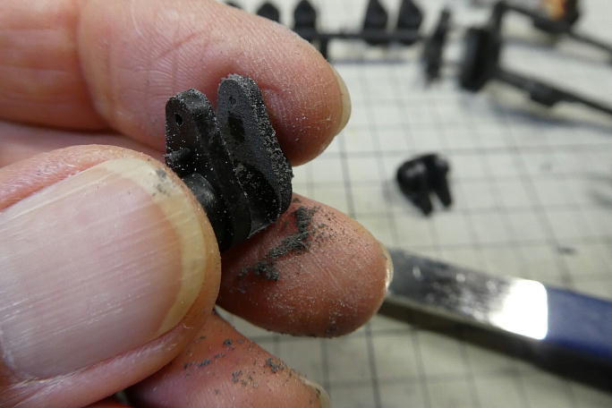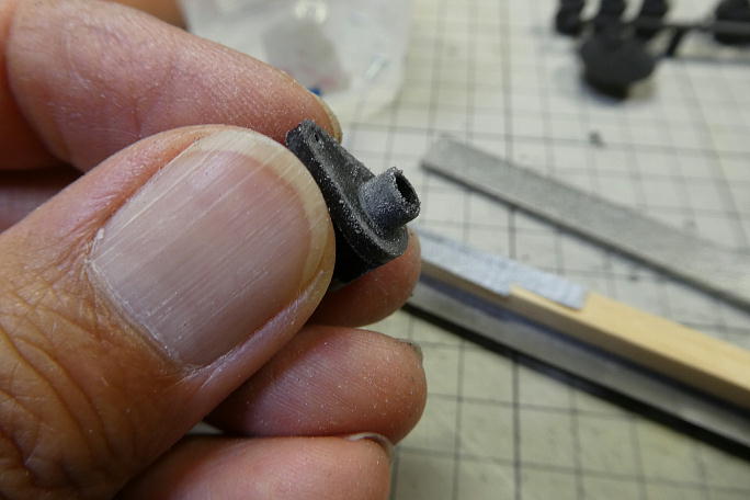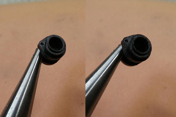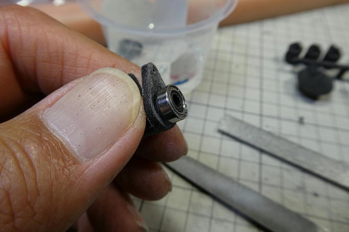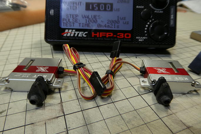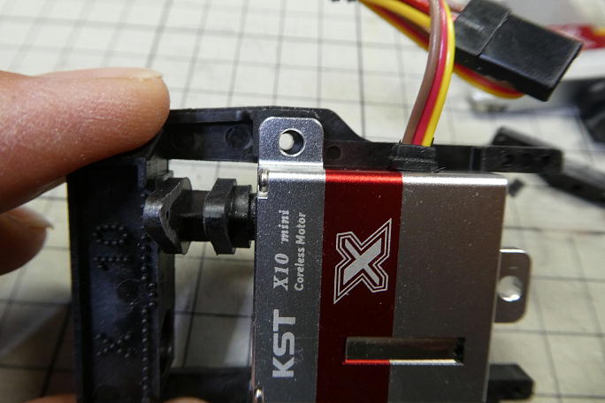 ![]() フラップサーボ用のホーンは大きい方から3番目を使用します。 上から2番目もギリギリ入りますが、3番目でも充分な ブレーキ舵角が取れます。 ![]() サーボラーメン製品はバリやヒケが多いので、組み付け前には仮組み、整形が必須です。 このホーンの場合、ロッド が渋かったので、擦り合わせを行いました。 ![]() 支持ベアリングが入るシャフト部分が太く、ベアリングが入りません。 無理すれば入りますが、サーボベッドからサーボ を外す際、本来サーボベッド側に残るベアリングが、ホーンと一緒に抜けてきてしまいます。 シャフト部分を削って、ベアリングが抜き差し出来るサイズに調整します。 ![]() KST X10mini用のホーンはとても渋く、手ではなかなかサーボに取り付けられません。 ホーンのサーボスプラインが入る部分をバーナーで温めて上げる事で、ギュッと押せば取り付けられる様になります。 ![]() 右が温めた状態です。 ![]() 1500μsのニュートラル1スプライン分オフセットさせてサーボホーンを取り付けます。 |