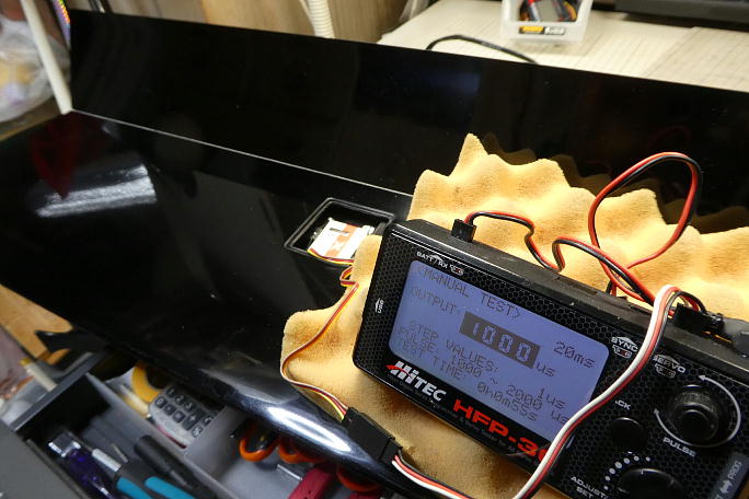 ![]() フラップのニュートラルはテンプレートを使って出します。 このテンプレートはもう何年も使っていて、初めてF3J機の Xplorer3を組んだ時に作った物です。 ![]() サーボは1500μsのニュートラルから190μsオフセットした位置をニュートラルとします。 ![]() サーボベッドの4隅のみ、一滴ずつの中粘度瞬間接着剤で仮接着します。 瞬間接着剤を滴下したら、直ぐに硬化促進剤 を滴下して硬化させます。 硬化促進剤は白化の少ないボブスミスを使用します。 一度サーボを取り外し、サーボベッドの全周に中粘度瞬間接着剤を流して、本接着をします。 瞬間接着剤を流したら、 こちらも直ぐに硬化促進剤を滴下して硬化させます。 硬化促進剤は白化の少ないボブスミスを使用します。 |