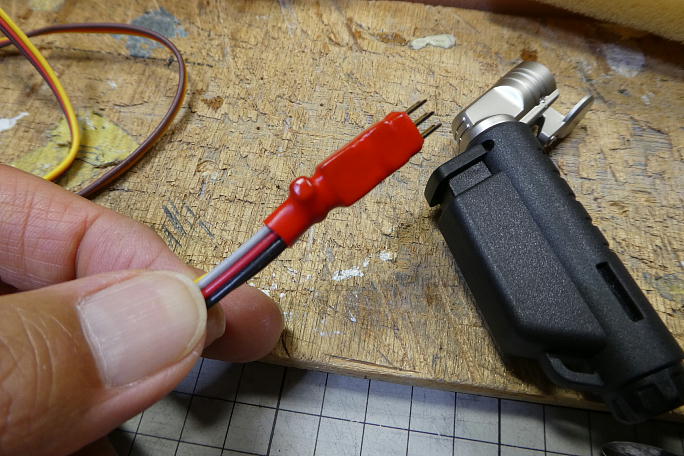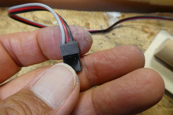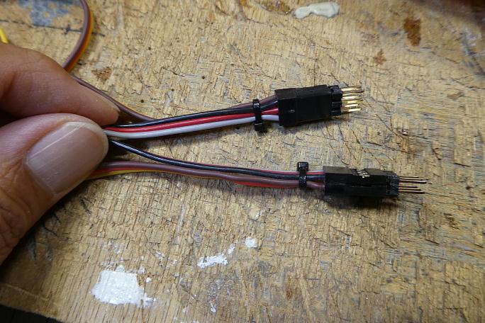 ![]() 胴体への接続コネクタはキット付属のピンヘッダーを繋げた物では無く、両端が長いピンヘッダーを使用します。 ピンは樹脂部分に刺さっているだけなので、動いてしまわないように低粘度瞬間接着剤を流して固めておきます。 ![]() コネクタを重ねるとコネクタの出っ張り部分が干渉してコネクタ後端がハの字に開いてしまうので、出っ張り部分を 削り落としておきます。 ![]() フラップサーボ、エルロンサーボの延長コードをピンヘッダーとタイラップを使用して束ねます。 私の場合、信号線 を前方に上をエルロン、下をフラップになるように束ねています。 ![]() キット付属のシュリンクチューブで保護します。 |