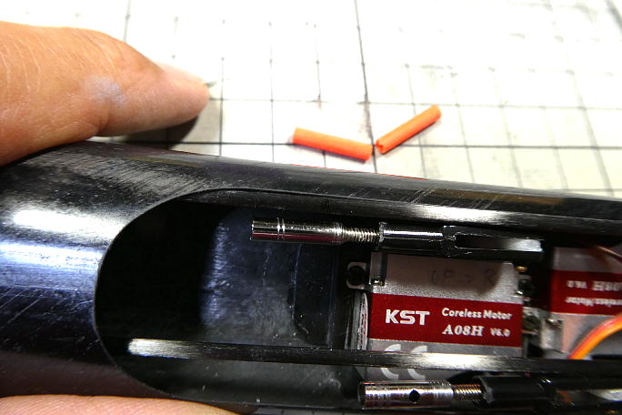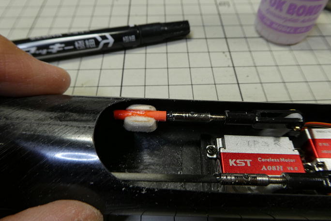 ![]() 最近のNAN Modelsの電動胴体胴枠はリンケージにアウターパイプを使用せず、胴枠に開けられた穴をリンケージロッドの ガイドにしているだけです。 サーボの手前の胴枠はサーボから300ミリ以上離れていて、ロッドのたわみが出てしまうので、サポートを取り付けます。 スクラップバルサからサポートの馬を削り出します。 ![]() 手前で予め通して置いた樹脂パイプに馬を接着し、その後に胴枠とサーボの中間点付近で馬と胴体内壁を接着します。 ![]() この辺りになります。 |
