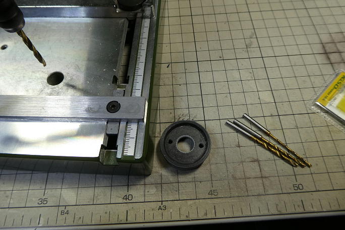 ![]() モーターマウントに開ける穴位置を正確にするために、パソコンで型紙を製作します。 使用するモーターは16ミリと19 ミリの穴がありますが、19ミリの穴で2点止めとします。 ![]() ![]() スプレー糊で型紙をモーターマウントに貼り付けて、ポンチを打っておきます。 ![]() ![]() リュータースタンドで、1.5ミリのドリルから順次ドリルを太くして、最終的に3ミリの穴を開けます。 ![]() モーターの肩がマウントの内側に僅かに当たり、しっかりマウントとモーターとが密着しないので、マウントの内側を削って 調整します。 ![]() ![]() 取り付けねじに皿ネジを使用するので、フリードリルを電ドラボールに咥えさせて皿穴加工を施します。 取り付けを確認しておきます。 |