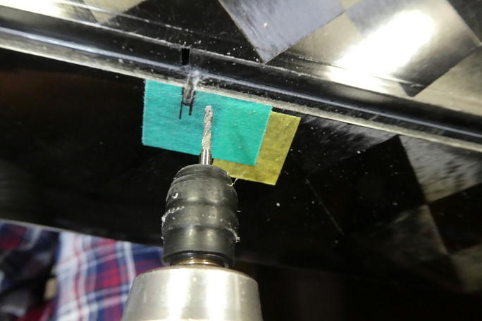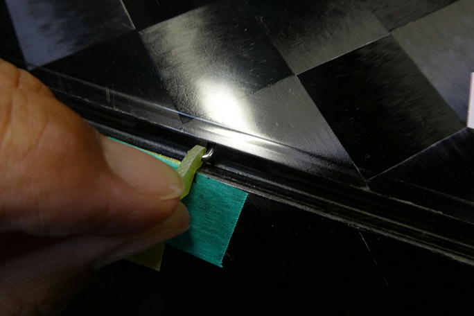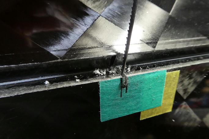![]() ロッドとフラップホーンを組み合わせて、フラップホーンの取り付け位置をフラップにマーキングします。 ![]() フラップホーンはフラップ内に潜り込むため、彫り込むラインをマスキングテープに書き込んでおきます。 ![]() リューターの切削ドリルビットでフラップの上面スキンを切り開きます。 切り込みはフラップのエッジから4ミリとしました。 ![]() 先端を尖らせた糸鋸の刃を使って、フラップ内のロハセルを掻き出します。 このツールはハンドランチのペグ取り付け 等でもコアを掻き出すのに重宝しています。 フラップホーンとフラップの面がツライチになるように切り欠きや彫り込み深さを調整します。 |