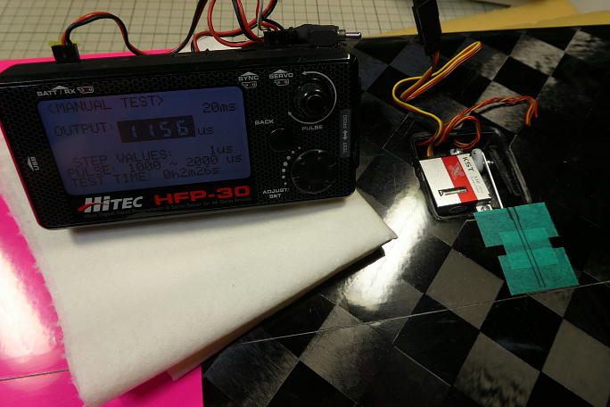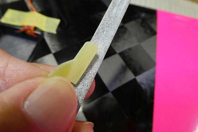 ![]() フラップサーボのサーボホーンは一度組んでありましたが、付属のリンケージロッドとサーボホールの位置との兼ね合いで、 1500μsのニュートラル時にサーボと直角の位置に取り付けることになりました。 の下がフラップです。 主翼側にフラップがアップ側の時のフラップホーンの逃げとロッドの取り出し穴を加工します。 ![]() フラップホーンを仮組みするとこんな感じになります。 ![]() サーボまで仮組みしたところです。 サーボのオフセットは350μsとなりました。 ![]() 押す方向には接着しなくても問題無く動くので、ブレーキ動作の動作確認をしておきます。 ![]() サーボホールの接着面を良くサンディングしておきます。 ![]() フラップホーンの切着面も良くサンディングして足付けをしておきます。 |