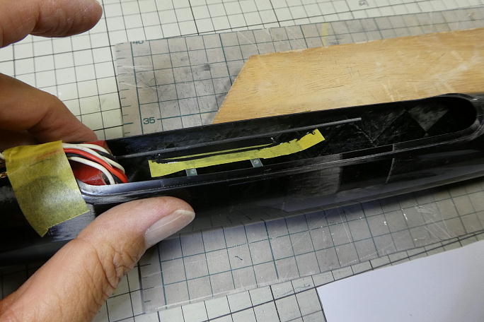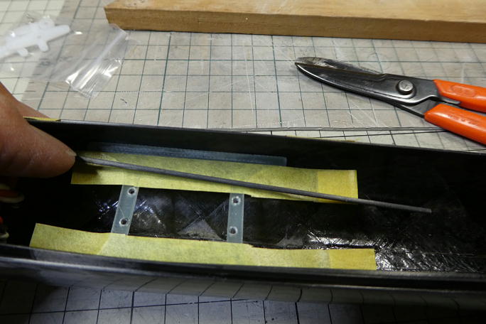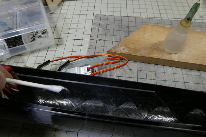 ![]() サーボベッドを接着する部分の胴体内壁をサンディングして清掃と足付けをします。 ![]() サンディングをした部分を硬化促進剤で拭いておきます。 清掃とプライマーとしての役目があります。 硬化促進剤には持続時間の長いロックタイトの712を使用します。 ![]() 胴体底部とサーボとの隙間を調整するためにサーボを取り付けた状態で胴体とサーボベッドを低粘度瞬間接着剤で 接着します。 受信機が赤いバラストチューブの下に入るので、受信機が入れられるギリギリ後ろにサーボベッドを配置しました。 ![]() 補強のカーボンパウダー入り5分エポキシを盛る準備をします。 胴体内壁から5ミリ離してマスキングテープを貼ります。 ![]() カーボンパウダー入り5分エポキシを盛り付けます。 ![]() 段差を作らないように、盛り作業が終わったら直ぐにマスキングテープは剥がします。 |