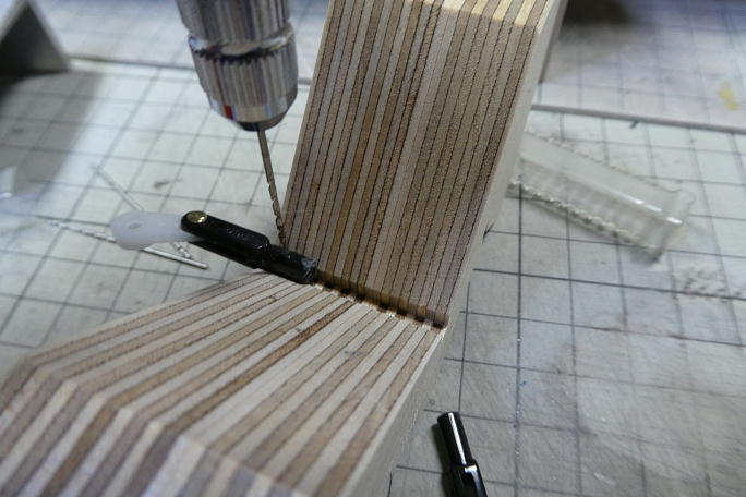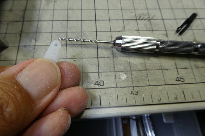![]() 最近のKSTサーボのサーボホーンの肉厚が約1.9ミリあって、対する金属、樹脂のクレビス共にホーンの入るスリット の幅が1.6ミリ程度です。 そのままのサーボホーンではクレビスが開いた状態で固定され、かなり動きが渋くなってしまうので、サーボホーンを 削って肉厚を調整します。 ![]() サーボホーンの穴をクレビスのピンに合わせて、1.6ミリのドリルで穴を広げます。 ![]() いつもはアジャスターを介してクレビスを取り付けるのですが、今回、スペースの問題でアジャスターは省略します。 リンケージロッドに直接クレビスを接着するので、接着剤がしっかり回る様に、1ミリの空気抜き穴を開けます。 ![]() 加工の済んだクレビスとサーボホーンです。 |