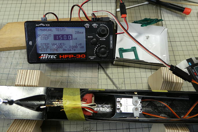 ![]() 簡易ニュートラル出しツールでラダーのニュートラルを出します。 ![]() サーボを1500μsのニュートラルに合わせて、ロッドのカット位置をマーキングします。 ![]() リューターの切削砥石でカーボンロッドをマーキング位置で切断します。 切断したカーボンロッドの接着部は サンディングしておきます。 ![]() リンケージのカーボンロッドとクレビスを低粘度瞬間接着剤で接着します。 |