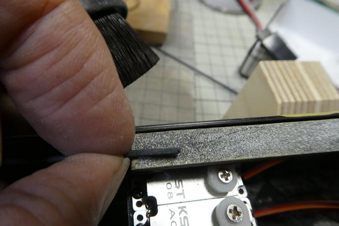 ラダーリンケージ同様、サーボのニュートラルを合わせてリンケージのカーボンロッドにマーキング、切断。 接着部分を