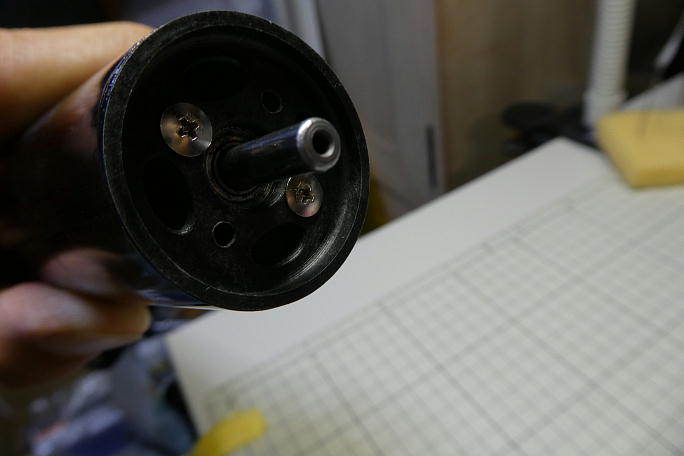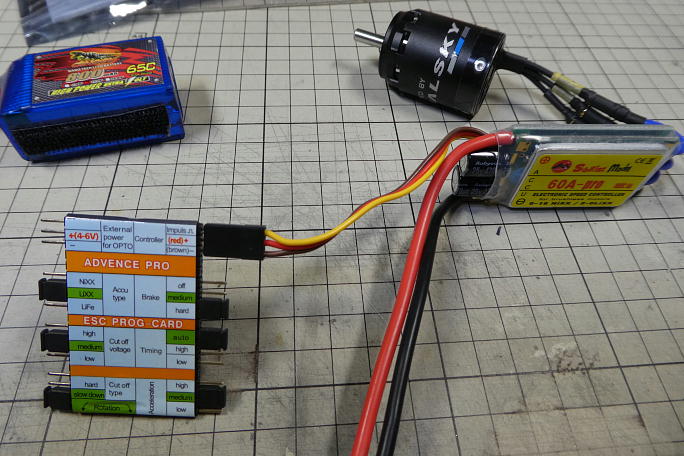 ![]() サーボテスターを使用して、モーターの回転方向の確認をします。 最低速でモーターを回し、シャフトに軽く触れて モーターの回転方向を確認します。 ![]() ESCにプログラムカードでブレーキ設定をします。 ダイレクトドライブなので、強さはハードとしました。 ![]() 長ボルトを使用して、モーターを胴体に引き込みます。 長ボルトを使う方法はFacebookで紹介されていた物ですが、 モーターを取り付けるときに、取り付け穴を探してグルグルモーターを回す事から開放されます。 ![]() 低頭ネジを使ってモーターを取り付けます。 二点止めにしました。 |