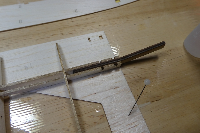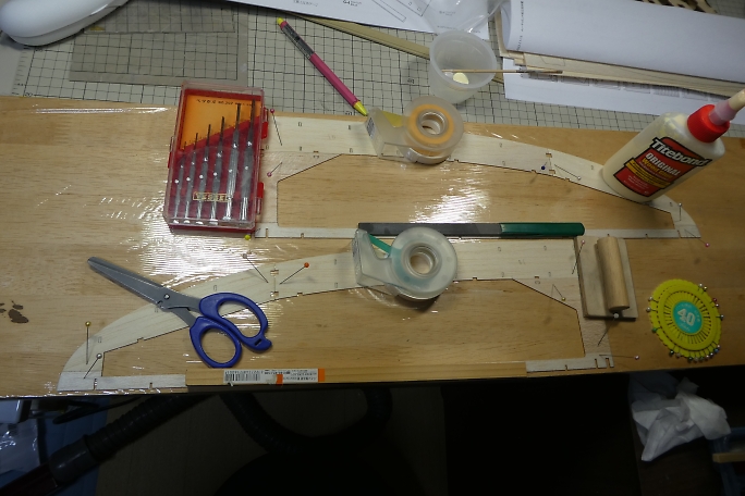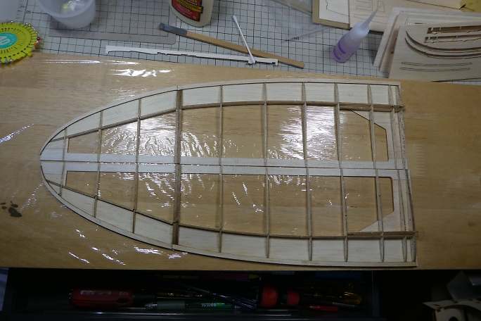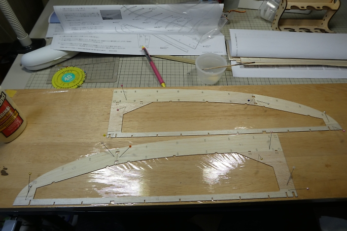 ![]() リブの接着前にはレーザーカットの足を削り落としておきます。 ![]() リブの位置決めは下面プランクにあるスロットにリブを差し込むだけですが、二本のスパーの間にカンザシが入る 部分は位置決め機構がありませんので、実際のカンザシを使ってスパーが曲がらないようにし上でスパーを接着 します。 ![]() 前縁のリブの持ち上がりに合わせる為に、下面プランクと定盤の間に1.5ミリスクラップバルサを挟み込むと丁度 良い具合にリブとプランク材が沿います。 ![]() ここまではあまり加工するところも無くサクサクと作業が進みます。 二段上反角の機体ではありますが、この段階では一枚物として製作します。 接着部を馴染ませる為に、軽く重しを掛けて一晩放置します。 |