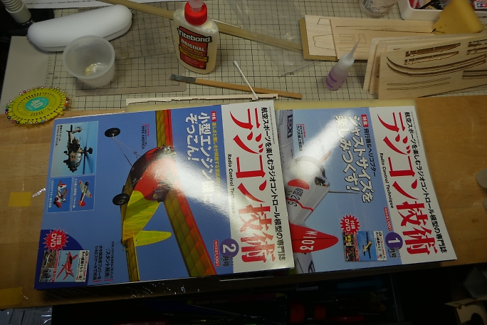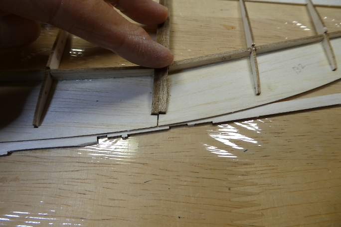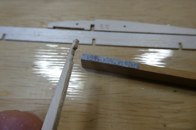 ![]() 下面プランク材から製作します。 レーザーカットされたパーツには足が残りますし、カット面が直角でない場合が あります。 突き合わせで接着する面はサンディングブロックなどで綺麗に面が出る様に調整します。 ![]() プランク材の貼り合わせにはタイトボンドを使用します。 竹串の先に少量タイトボンド付けて、極力はみ出さない様に 接着面に乗せていきます。 ![]() 定盤の上で、後縁材と中央プランク材が直角になるように並べ、接着します。 この段階から左右を意識して作ると 同じ物を2枚作ってしまう事が防げます。 ![]() プランク材は1ミリバルサで薄いので、波打たないように軽く重しを乗せて一晩乾燥させます。 ![]() 乾燥後に、段差や接着跡をサンディングして取り除きます。 バルサによって、微妙に厚みが違っていたしします。 |