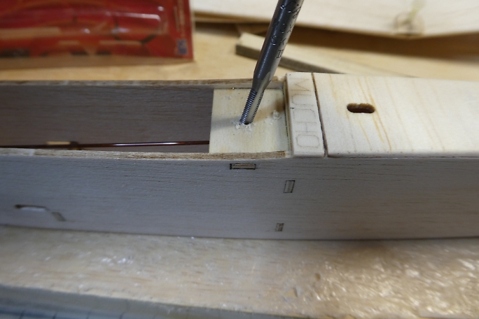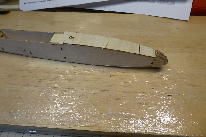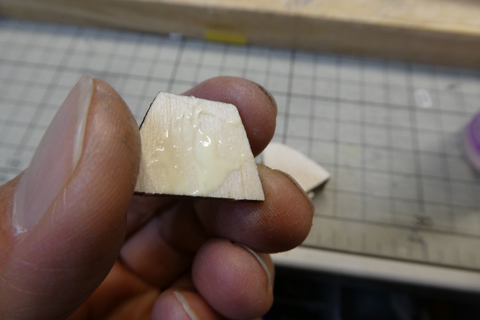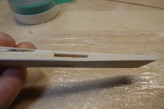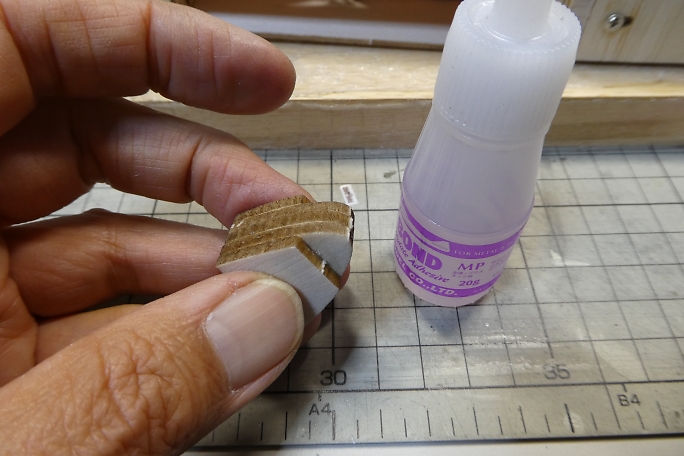 ![]() ![]() ノーズブロックは3みりバルサの5枚積層になります。 中央の3枚のみ強度を増すためにタイトボンドで接着、両脇、外側 の2枚は中粘度瞬間接着剤で接着しました。 ![]() 胴体とノーズブロックの接着面の面出しをして、隙間無く合わせられるようにしておきます。 ![]() ノーズブロックを瞬間接着剤で接着します。 写真を撮り忘れましたが、この後に全体をサンディングしてして整形していきます。 ![]() 仮組みをして見ようとしたら、垂直尾翼の刺さるスロットがありませんでしたので切り込んでおきました。 |
