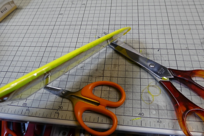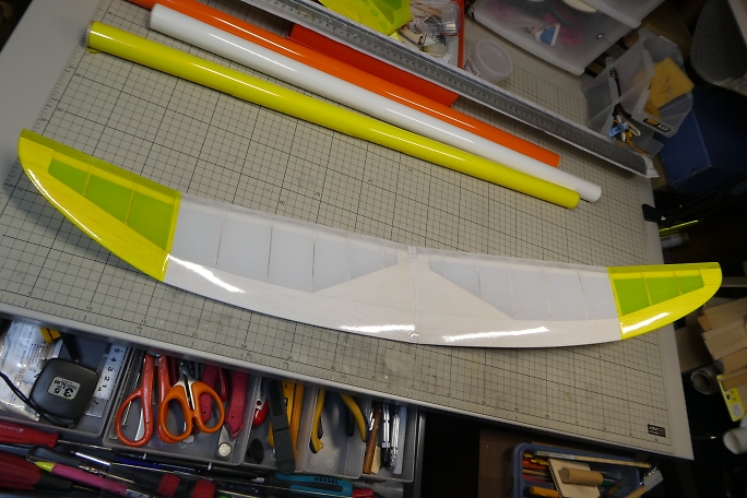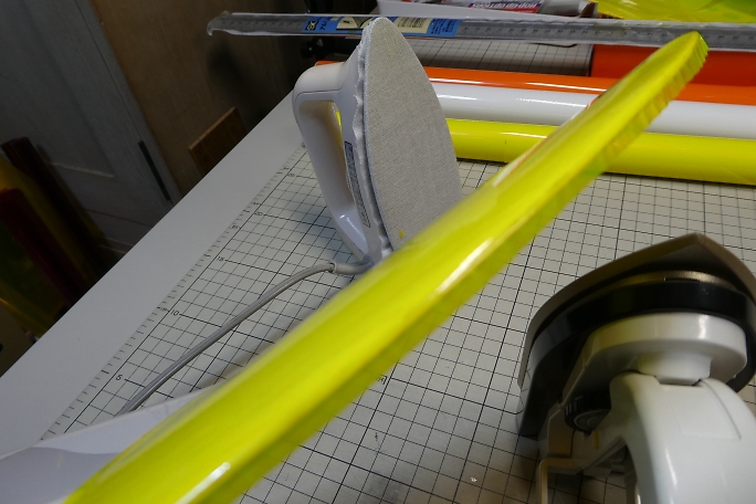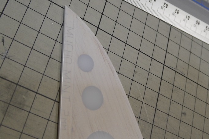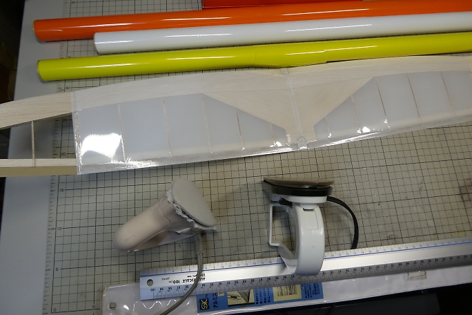 ![]() ![]() フイルムを貼る前には掃除機で徹底的に粉を吸った上で、ウエスで磨き上げます。 これによってフイルムの付きが 格段に良くなります。 ![]() 前縁が円弧なので、サークルカッターを使ってフイルムを切り出します。 私の場合、主翼のサイズ+6ミリで切っています。 ![]() 裏面から貼り始めます。 フイルムは端の一点のみを貼り付けてから手でピンと張って、アイロンの温度は糊は融けるけど フイルムは縮まない温度で押さえる様にして貼って行きます。 ![]() 下面を貼った後にフイルムを縮めたら主翼が反ってしまい、一度全部フイルムを剥がすハメになってしまいました。 表面も貼り終えるまで縮める行為はしない方が無難です。 ![]() 上面を貼り終えた所で、高温にセットした二台目のアイロンをフイルムを縮めていきます。 ![]() リブに開いている穴、メーカーで開けてきている穴ですが、このあなが重要です。 空気が抜けて、加熱時にフイルムが 脹らむのを防いでくれる穴です。 ![]() 外翼の翼端部分は高温アイロンで少しずつ縮めなから折り返していきます。 ![]() ![]() 裏側に完全に回り込ませて貼り込みます。 ![]() 主翼のフイルムが貼り終わりました。 |