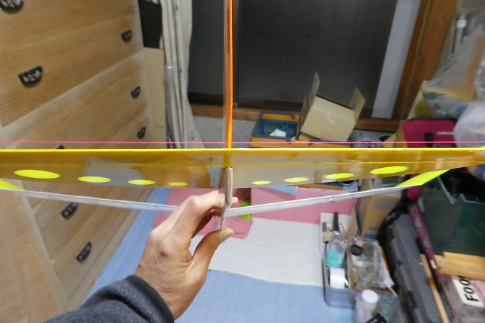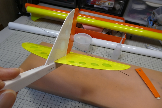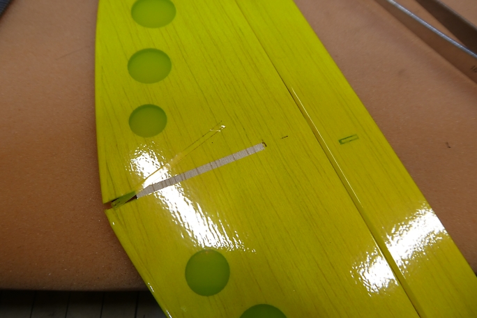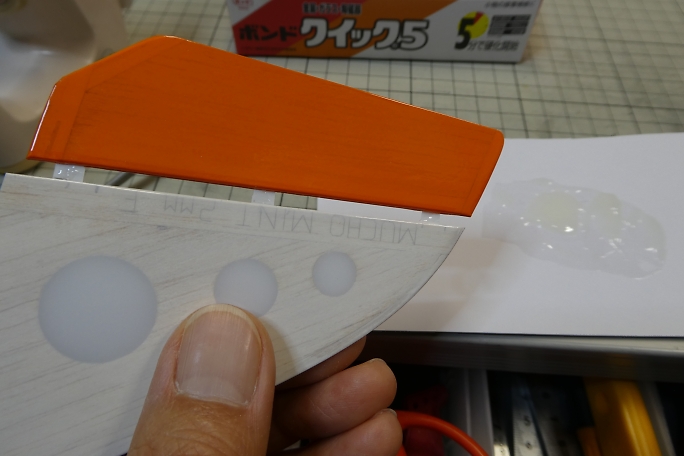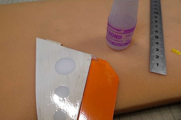 ![]() ヒンジは事前に用意して置いたムサシノのライトヒンジを5ミリ幅に切った物です。 ヒンジスロットも加工済みなので、 フイルムに切れ込みを入れるだけです。 片側はヒンジを差し込んで低粘度瞬間接着剤を流して接着します。 ![]() 動翼側は今回は5分エポキシを使ってみました。 尾翼の厚みが薄く、低粘度瞬間接着剤が回りすぎるのを嫌った 為です。 半差し状態で出でいるヒンジ面にごく少量の5分エポキシを塗って、動翼を全部差し込みます。 はみ出る5分エポキシ はアルコールを染みこませた綿棒で拭っておきます。 ![]() 水平尾翼も同様に動翼取り付けを行い、全ての動翼の取り付けが完了しました。 ![]() ARF状態になりました。 |