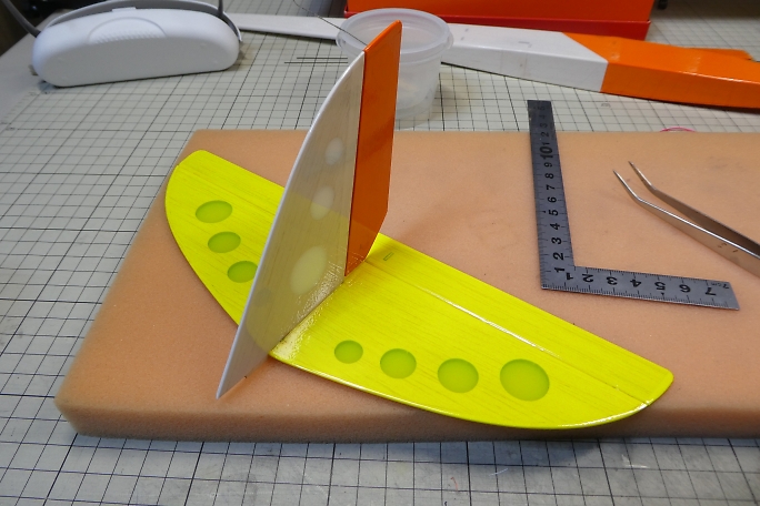 ![]() 0.5ミリFRP板から切り出したラダーホーンを低粘度瞬間接着剤で接着します。 ![]() エレベーターホーンも同様に行います。 キットにはベニヤ製のホーンが付属しますが、それよりはかなり小さな物になっています。 ![]() 垂直尾翼を接着する部分のフイルムを剥いでおきます。 ![]() 角度に注意して水平尾翼と垂直尾翼を低粘度瞬間接着剤で接着します。 |