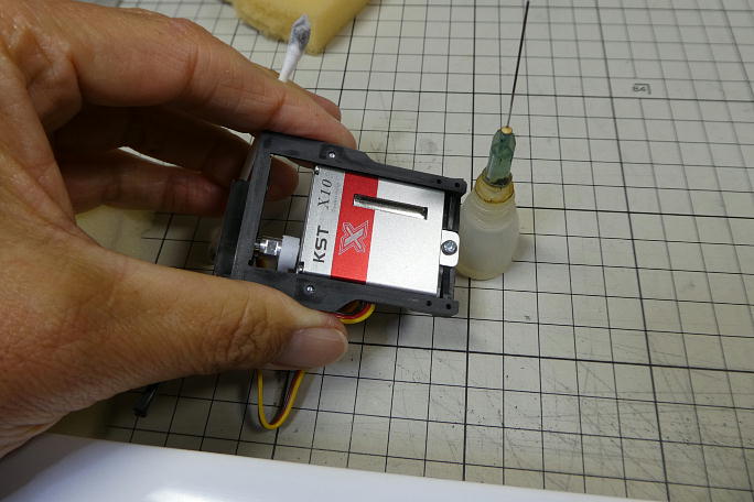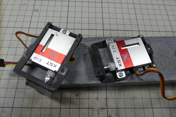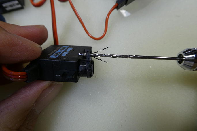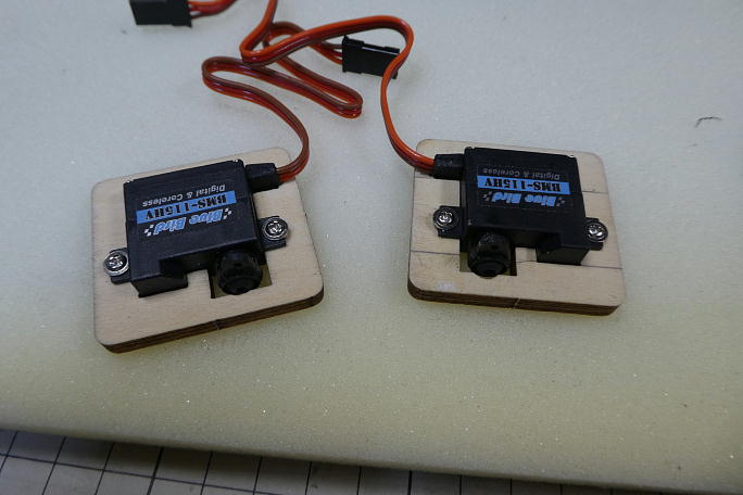 エルロンサーボです。 ブルーバードのサーボに付属するサーボホーンは取り付けが緩く、ガタが出る心配があります。 ただ、このサーボのスプラインはフタバと同じなので、フタバのサーボホーンと互換があり、フタバのサーボホーンと 組み合わせると、ガタが出ません。 ![]() ![]() 1500μsのニュートラルでホーンの使用する部位を見付け、他の部分を切り取って成型します。 使用したのは中心から5.5ミリの位置の穴です。 ![]() サーボホーンの穴を1.5ミリのドリルで拡大しておきます。 ![]() ベニヤ製のサーボベッドにコードとサーボホーン取り付けねじの逃げを加工しておきます。 ![]() 2×8のツバ付きネジでサーボを取り付けます。 |