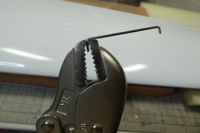 ![]() マーキングした曲げ位置に従って、ロッドをキッチリと直角に曲げます。 バイスプライヤーでピアノ線をしっかりと 咥えて、ハンマーで叩いて曲げます。 ![]() エルロンホーンの表面をサンディングして足付けをします。 ![]() サーボホールの接着面をサンディングします。 この機体ではサーボホールに1枚追加でカーボンクロスが貼って ありますが、樹脂が柔らかいのかサクサク削れて真っ黒です。 ![]() ロッドを取り付けた状態でエルロンホーンを低粘度瞬間接着剤を流して接着します。 この工法では、ロッドは後から では取り付けが出来ませんし、取り外しも後縁材に逃げを加工しないと外れません。 ![]() サーボホールの接着面をロックタイトの712を染みこませた綿棒で拭いておきます。 ![]() サーボを1500μsのニュートラルにして、エルロンをフラップのニュートラルと舵面をツライチにした状態で、サーボ ベッドを中粘度瞬間接着剤で接着します。 |