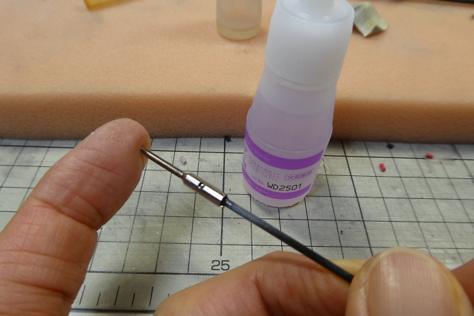 ![]() エレベーターリンケージのリンケージロッドの接着面をサンドペーパーでサンディングしておきます。 足付けとロッド 成形時の油脂除去が目的です。 ![]() ロッドエンドとロッドの接着面を硬化促進剤で拭いておきます。 持続時間の長いロックタイトの712を使用します。 ![]() ロッドとロッドエンドを低粘度瞬間接着剤で接着します。 この場所の接着には隙間にしっかり流れる低粘度瞬間接着剤 が適切です。 |