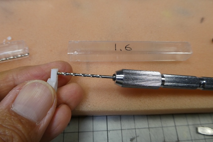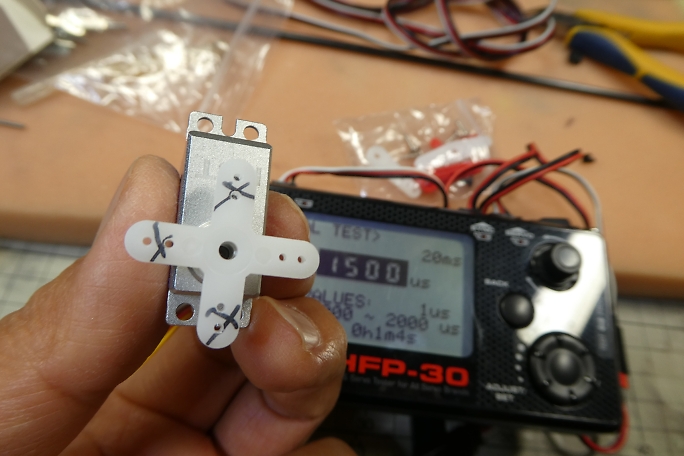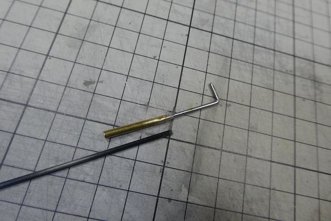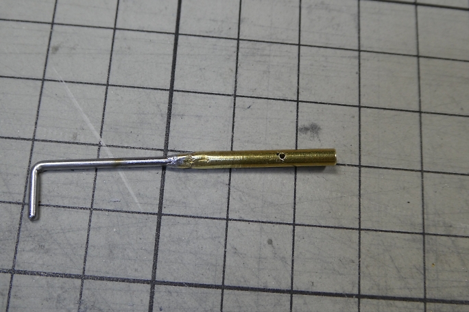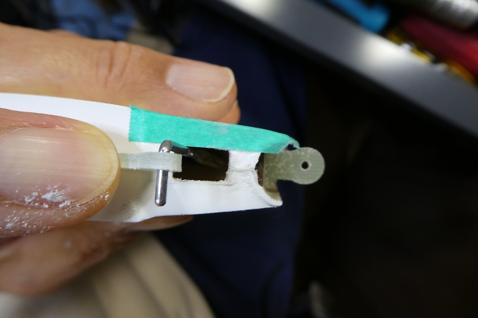 ![]() 1500μsのニュートラルに合わせて、サーボホーンの使用する部位を見付けます。 不要部分はマーキングをして カット、整形をします。 ![]() 金属クレビスのピンに合わせて、サーボホーンの穴を1.6ミリドリルで拡大しておきます。 ![]() 金属クレビスはフル舵角でも干渉しないようにサーボホーンの逃げを加工しておきます。 ![]() ここまで動作出来ます。 ![]() 内径2ミリの真鍮パイプに1.5ミリのエレベーターロッドをハンダ付けします。 首の部分は1.5ミリのロッドに合わせて、 圧着ペンチを使って絞りました。 ![]() 接着を確実にする為に0.8ミリの空気抜き穴を開けておきます。 |
