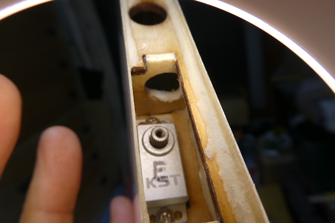 ![]() ![]() エレベーターサーボを取り付けます。 リンケージを仮組みしたところ、ロッドが干渉したのでロッド穴を広げました。 |