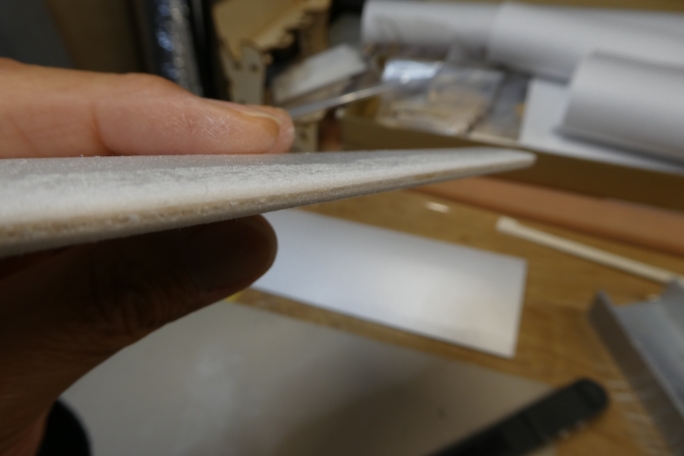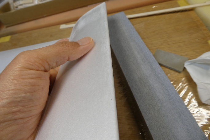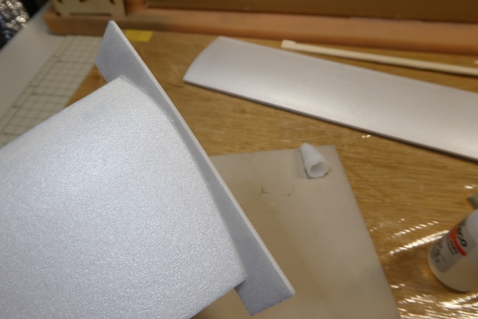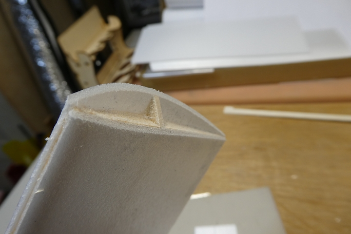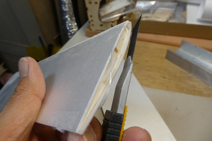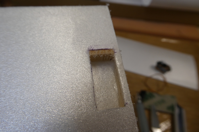 ![]() 後縁を仕上げます。 板材を角度を付けて付き合わせているので、後縁がくの字になっているのを平らになるように サンディングブロックで削ります。 ![]() 前縁も仕上げます。 図面の翼型を参考に、前縁を丸めます。 ![]() 中央の接合部もはみ出たスチレンペーパーをカットして、サンディングブロックで仕上げます。 ![]() エルロンサーボの取り付け位置を図面から取り出し、実際に使用するサーボのサイズをマーキングして上面プランク材 を切り取ります。 ![]() サーボを納めてみました。 ![]() サーボの取り付け部分は1.5ミリのスチレンペーパーだけで全く強度が無いので、切り欠きを1.5ミリずつ広げて、 1.5みりバルサを縦目で接着、補強とします。 |
