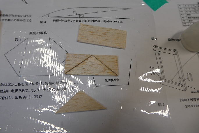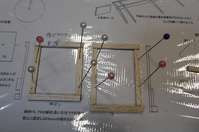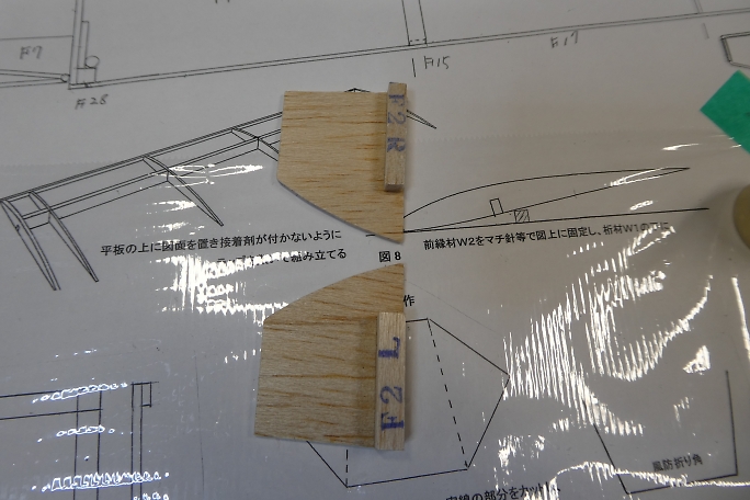 ![]() ムサシノ式で胴枠を作ります。 図面上にマチ針で貼り付けにして、中粘度瞬間接着剤で組んで行きます。 ![]() F5はダウエルが通ります。 ダウエル材を挟んだ状態でダウエル受けのバルサ材を接着します。 ダウエルが接着 されないように接着剤の量を加減します。 ![]() 接着剤が硬化して位置決めが出来たらダウエルは取り外します。 ![]() ノーズ部の補強材は左右の区別があります。 この部材によってサイドスラストが付けられます。 ![]() メインギヤー受けを組み立てます。 三角材はメインギヤー押さえなので位置決めだけに使用して、接着しないように します。 全ての胴枠部材は端面をサンディングして平面出しと角をキッチリ立てておきます。 |
