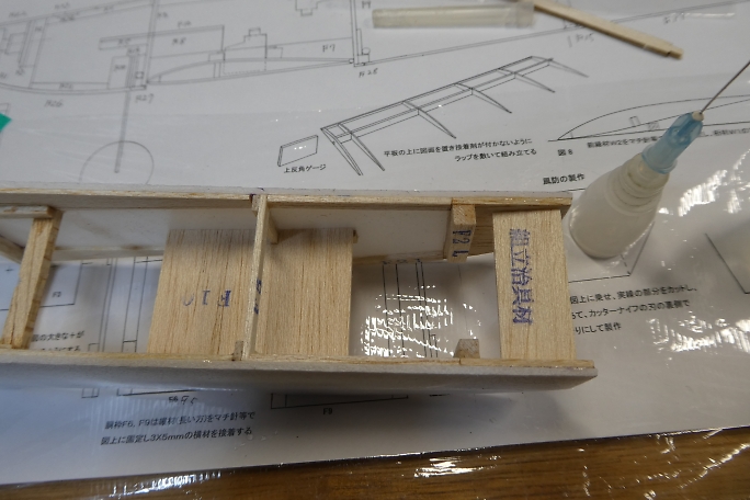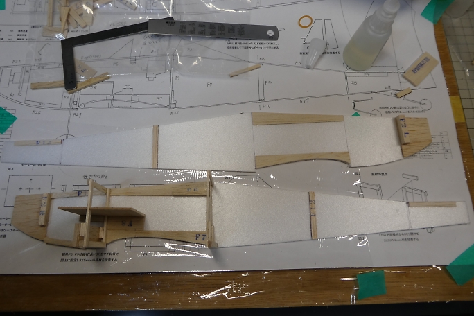 ![]() 片側の側板に胴枠を接着していきます。 主翼前後の胴枠は幅が同じなので側板対して直角になるように接着します。 接着には発泡用瞬間接着剤を使用します。 ![]() ![]() 接着できる部材は全て接着しておきます。 捻れに注意しながら左右の側板を接着します。 |
