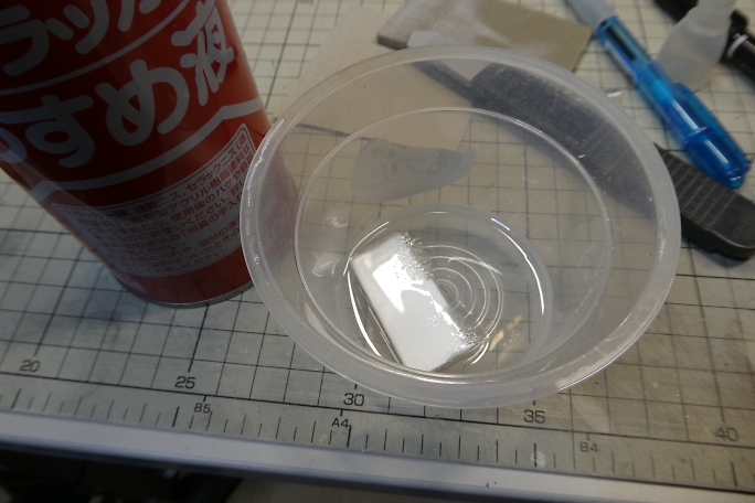 ![]() 尾輪用のサポートを作っておきます。 スチレンペーパーの切れ端にガラスクロスを巻き付け、発泡用瞬間接着剤を 塗ったらビニール袋を掛けて均し、硬化促進剤で固めます。 ![]() 硬化した物ょシンナーに浸けて、芯のスチレンペーパーだけを溶かします。 ![]() この様なU字状の物だけが残ります。 |