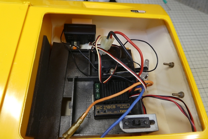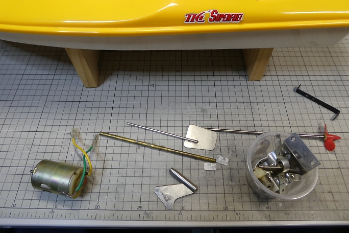 Yahooオークションで落札して、家に届いた状態です。 成型色ですが、全体的にくすんでいて、船底の白色は黄ばみが 目立ちます。 キャノピー部分はカッティングシートで色分けがされていました。 オークションで落札した内容には、この船体の他に AM送信機とニッカドバッテリー、充電器も含まれていましたが、こちらは使用するつもりはありません。 ![]() モーターは540ノーマルモーターで、ラジコンボートを知って居人にはお馴染みの地球堂のカップリングジョイントが 使用されています。 スタンチューブの軸受けにはニップルネジが切られていますが、注油が出来る構造にはなっていません。 ![]() 樹脂スクリューがセットされたドライブトレインですが、スクリューには経年劣化が見られました。 また、ブラケットがガタガタしています。 ![]() メカルームは樹脂製のメカトレイがあり、ノーマルサーボ、AM受信機、アンプがセットされたままですが、こちらは 手持ちの物と入れ換えるので使用はしません。 |