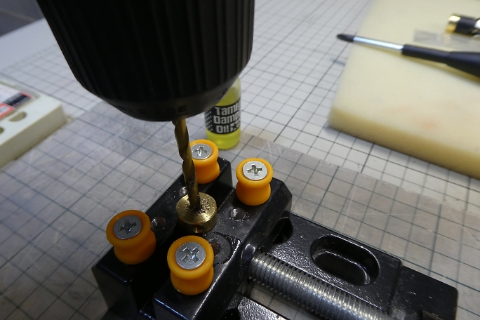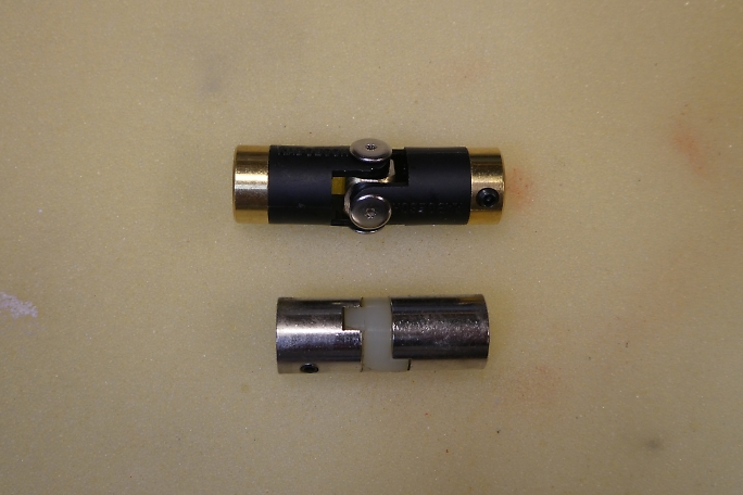 ジョイントは地球堂模型のカップリングからユニバーサルジョイントに変更します。 地球堂模型のジョイントは、モーター軸 とシャフトのスラスト角が少しでも違うと、酷い騒音を出します。 ジョイント長が違いますが、モーターの取り付け位置が変更出来るので、モーター位置をずらして対応します。 ![]() スクリューシャフトは地球堂模型規格の3.5ミリ径です。 一般的な小型ボートのシャフトは4ミリで、ジョイントも色々な 軸径に対応する作りではありますが、3.5ミリには対応がありませんでした。 シャフトを4ミリに替えてしまおうかとも換え替えましたが、ボートのパーツがほぼほぼ全滅していて、まともに部品が 揃わないのが現状です。 モーターは3.2ミリシャフトで問題が無いので、スクリューシャフト側を3.2ミリの物を購入して、3.5ミリに広げる事に しました。 オイルを差しながら少しずつ広げて行きます。 オイルは余っているダンパーオイルです。 ![]() 仮組みをしてみました。 ガタ無く入りました。 |
