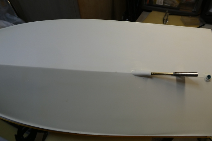![]() ブラケット、スタンチューブ、舵鞘をマスキングして、船底を塗装します。 ホワイトを塗った後にパールホワイトを吹きました。 差の後にクリアを吹いて仕上げます。 ![]() クリアが柚肌になっしまったので、後で塗り直しています。 |