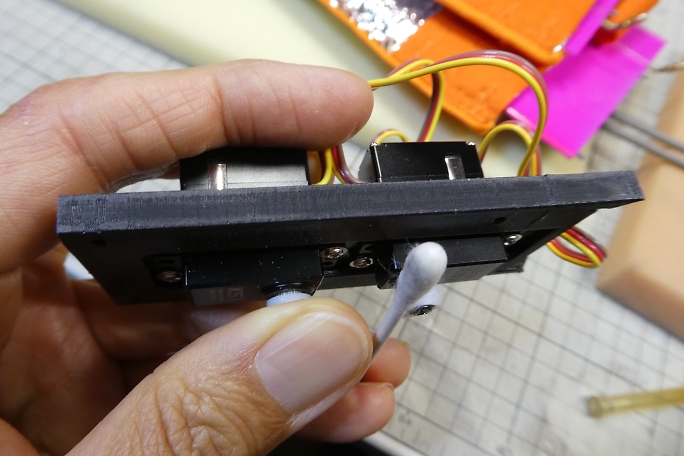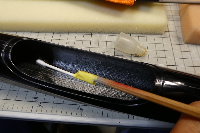 ![]() 胴体のサーボベッドを接着する部分をサンディングしておきます。 手の入らない奥になるので、バルサ棒にサンドペーパー を貼り付けた物を使ってサンディングします。 ![]() サーボベッドの接着面を硬化促進剤で拭いておきます。 ロックタイトの712を使います。 ![]() 胴体の接着部にも硬化促進剤で拭いておくのですが、こちらも届かないので、棒の先に硬化促進剤を染みこませた綿棒 を取り付けて行います。 |